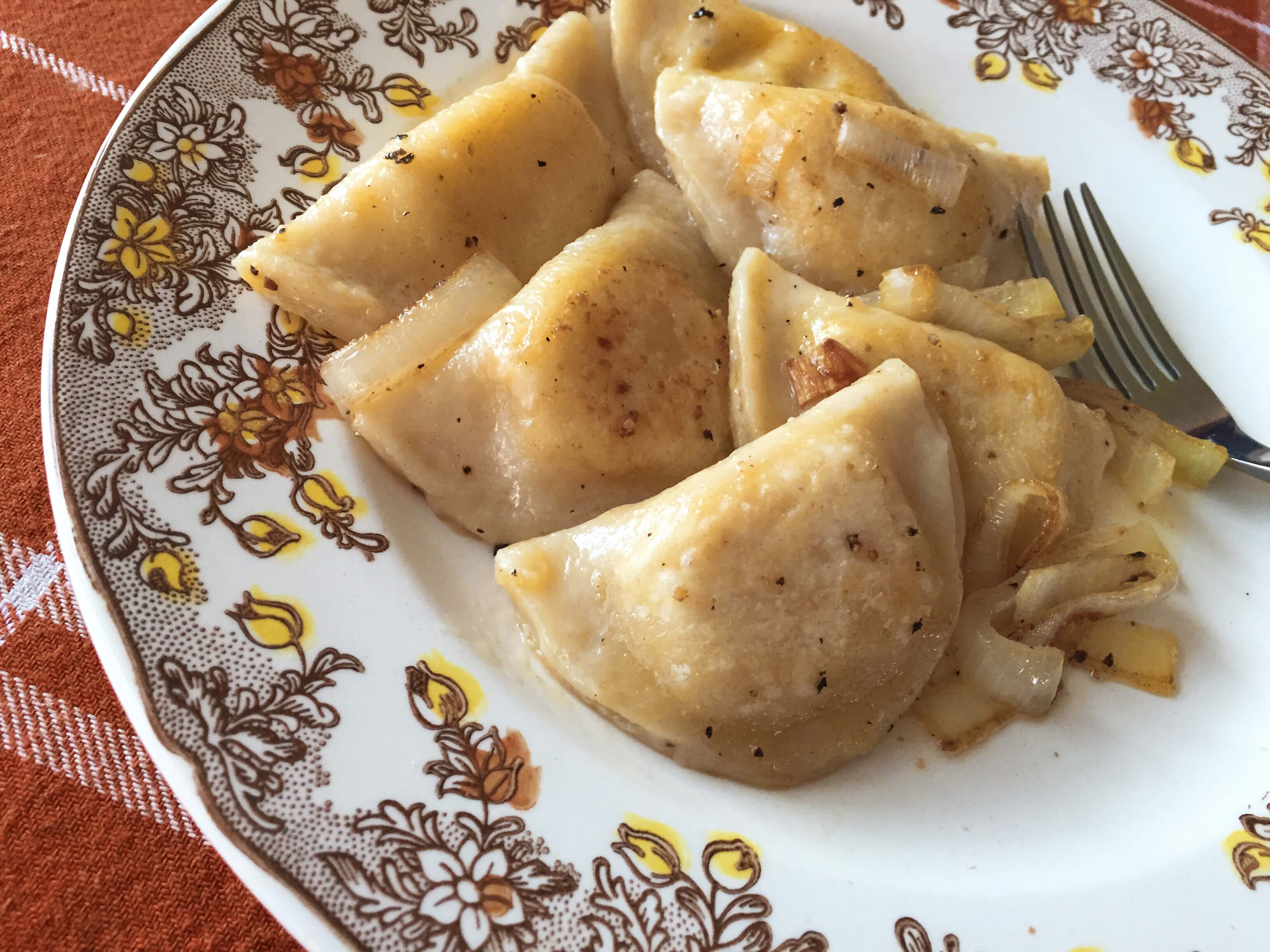 In a frying pan, heat two tablespoons of butter; add half an onion, sliced, and salt and pepper. When the onions are soft (and filling your home with a wonderful smell), toss a few pierogi into the frying pan. Saute until the dough is slightly browned. This will make for a slightly crisp exterior, which makes pierogi so so good!