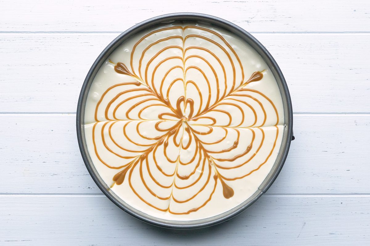 If you’re looking for a flower design (and you don’t have time to master cake decorating), look no further. Simply pipe caramel in a clover-shaped pattern (or a four-petaled flower). Repeat that shape over and over until you get to the outer edge of the springform pan. Then, use a toothpick or skewer and pull it through the center of each petal. Finish it off by piping a bit of extra caramel in the spaces between the petals and pull the toothpick through that as well. The result is pretty stunning.