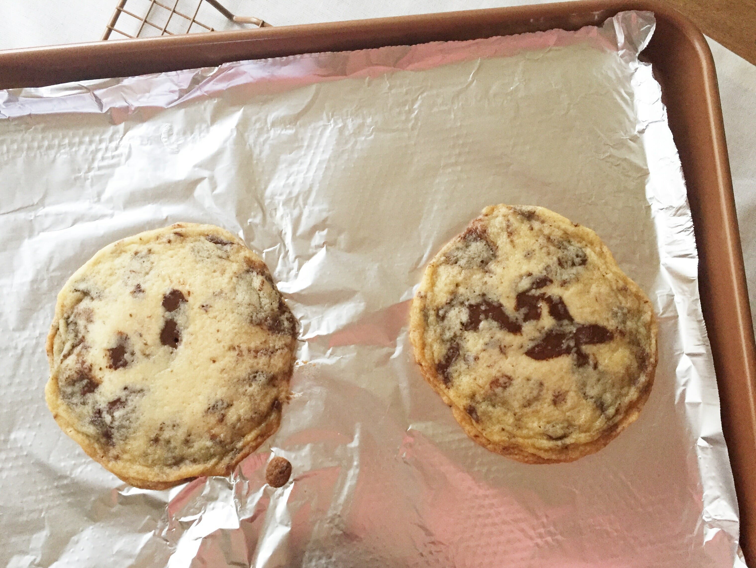 Now, the standard protocol for these cookies is over! Rather than lining a baking tray with parchment, the recipe recommends lining your cookie sheet with aluminum foil—dull side up—for crispier cookies. That was easy enough for me. The recipe goes on: Instead of dropping dough by the tablespoon onto the sheet, it recommends a whopping 1/3 cup of dough per cookie. I love cookies, so the bigger the better. Knowing that these would spread after wiggling, jiggling and banging the pan, I played it safe and only scooped two per sheet. Spoiler alert: This was the right idea.