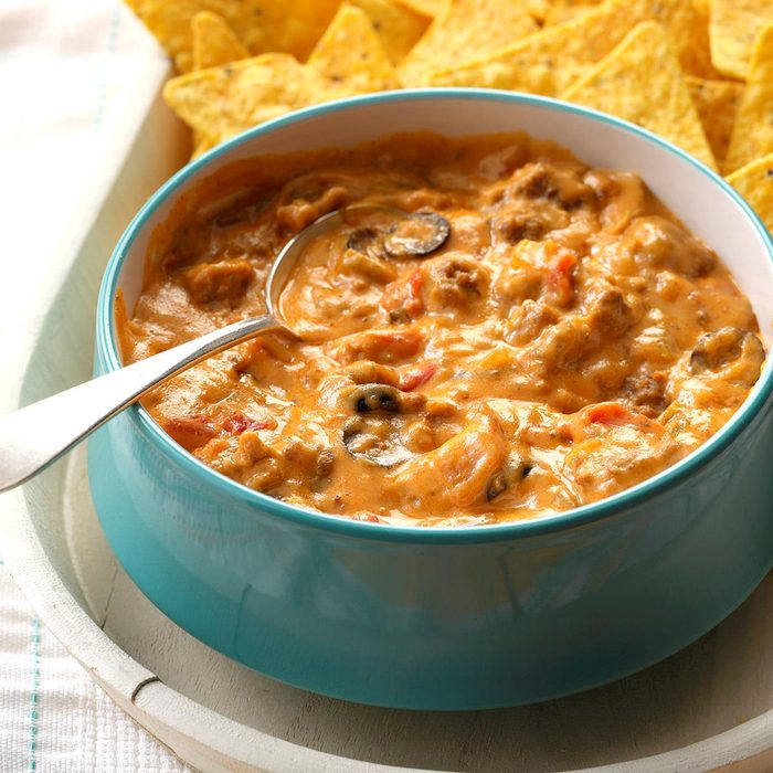 Try this recipe for a warm, hearty snack with a bit of a kick. It's a hit with my family, and guests rave about it, too. Ideal for parties, it makes a big potful. The only "utensil" you'll need to serve it with is a brimming bowl of tortilla chips. —Carol Smith, Sanford, North Carolina