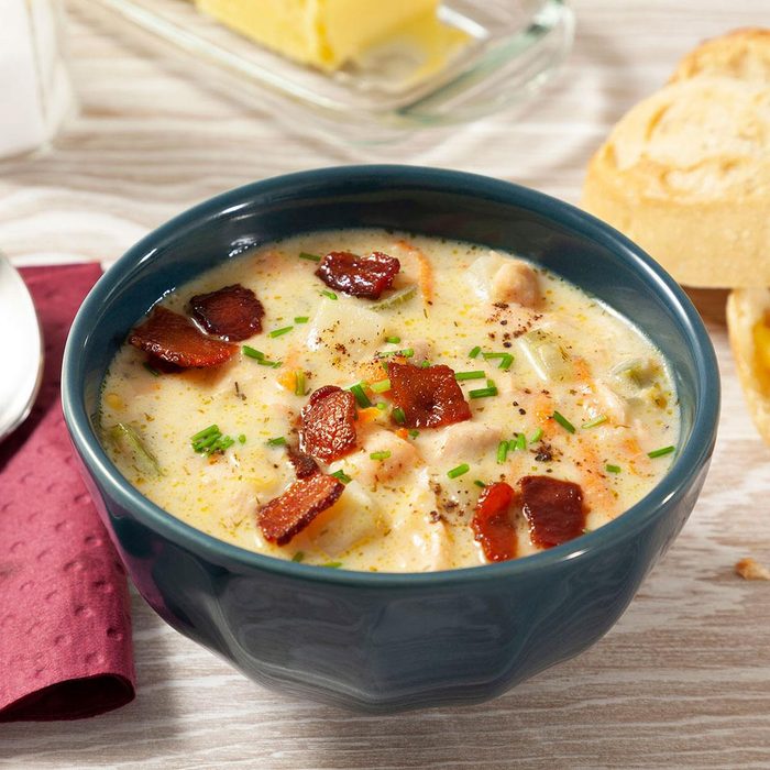 Anyone who needs convincing about the deliciousness of canned salmon should try this super-creamy, hearty salmon chowder, which is packed with vegetables and protein. The secret ingredient is a can of cream-style corn, which adds a touch of sweetness. We like to garnish this chowder with crumbled bacon, minced chives and cracked black pepper.