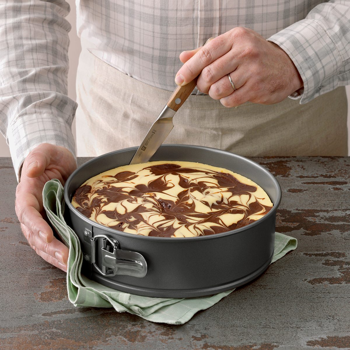 Leaky pans are a cheesecake’s arch-nemesis. For a foolproof way to leak-proof any springform pan, place your springform inside a slightly larger cake pan before placing it in your water bath prior to cooking.