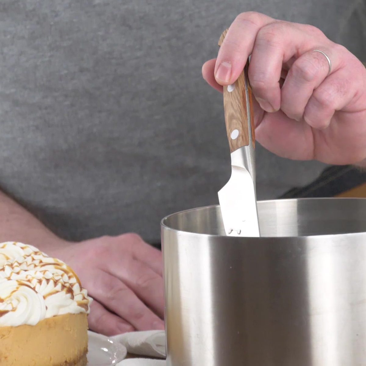 Slice cheesecake while it’s cold. Trust us, it’s a lot less messy. To do this, dip a long, thin knife in very hot water, wipe the blade with a paper towel, then slice. Clean and rewarm the knife after each cut.