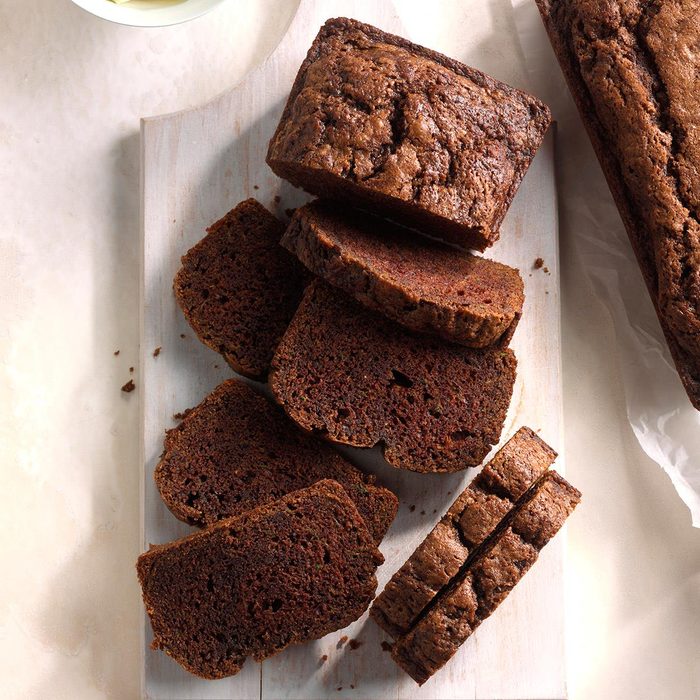 I shred and freeze zucchini from my garden each summer so that I can make this bread all winter long. My family loves this chocolaty treat. —Shari McKinney, Birney, Montana