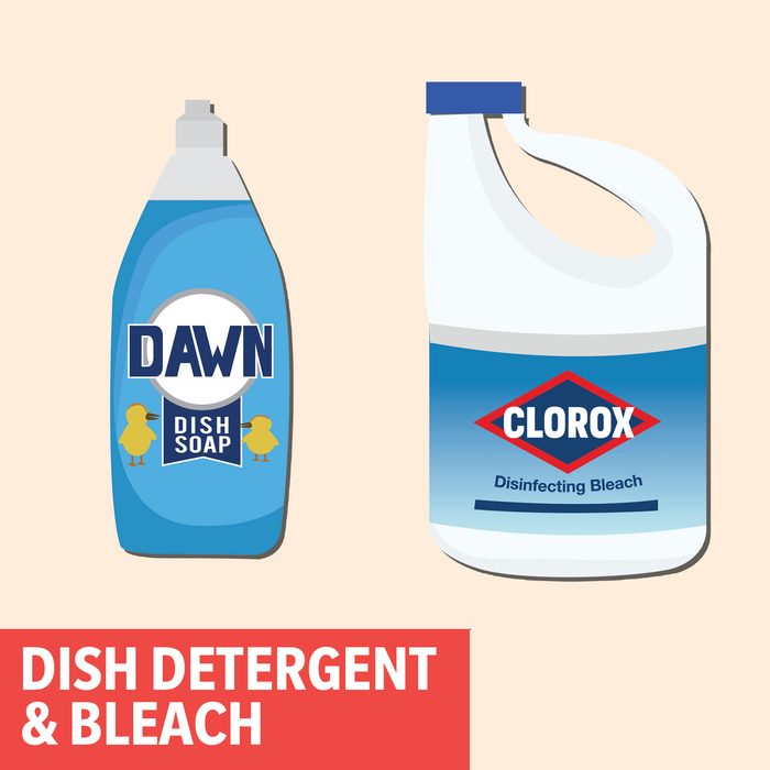 Mixing dish soap and vinegar is a great cleaning agent, but never replace the vinegar with bleach. Though many common dish detergents, like Dawn, don’t have ammonia in their ingredient lists, some dish soaps might have amines, which are organic compounds derived from ammonia. Because of this, bleach should not be mixed with dish detergents.