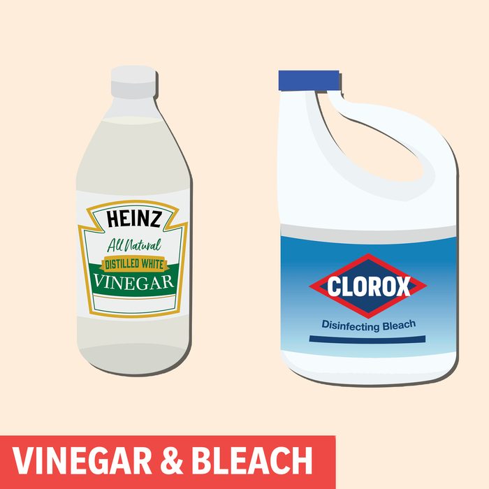 Two of the most common disinfectants are vinegar and bleach, but surprisingly, they should never be used together. The acid in vinegar releases toxic chlorine and chloramine vapors when added to bleach. This combination could cause chemical burns to your eyes and lungs.