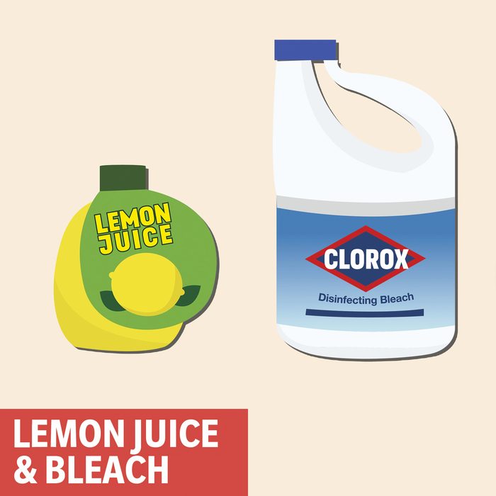 Acidic lemon juice is an effective cleaner for things like your microwave or water-stained faucets. But just like acidic commercial cleaning products, mixing lemon juice and bleach should be avoided because it results in toxic chlorine gas.