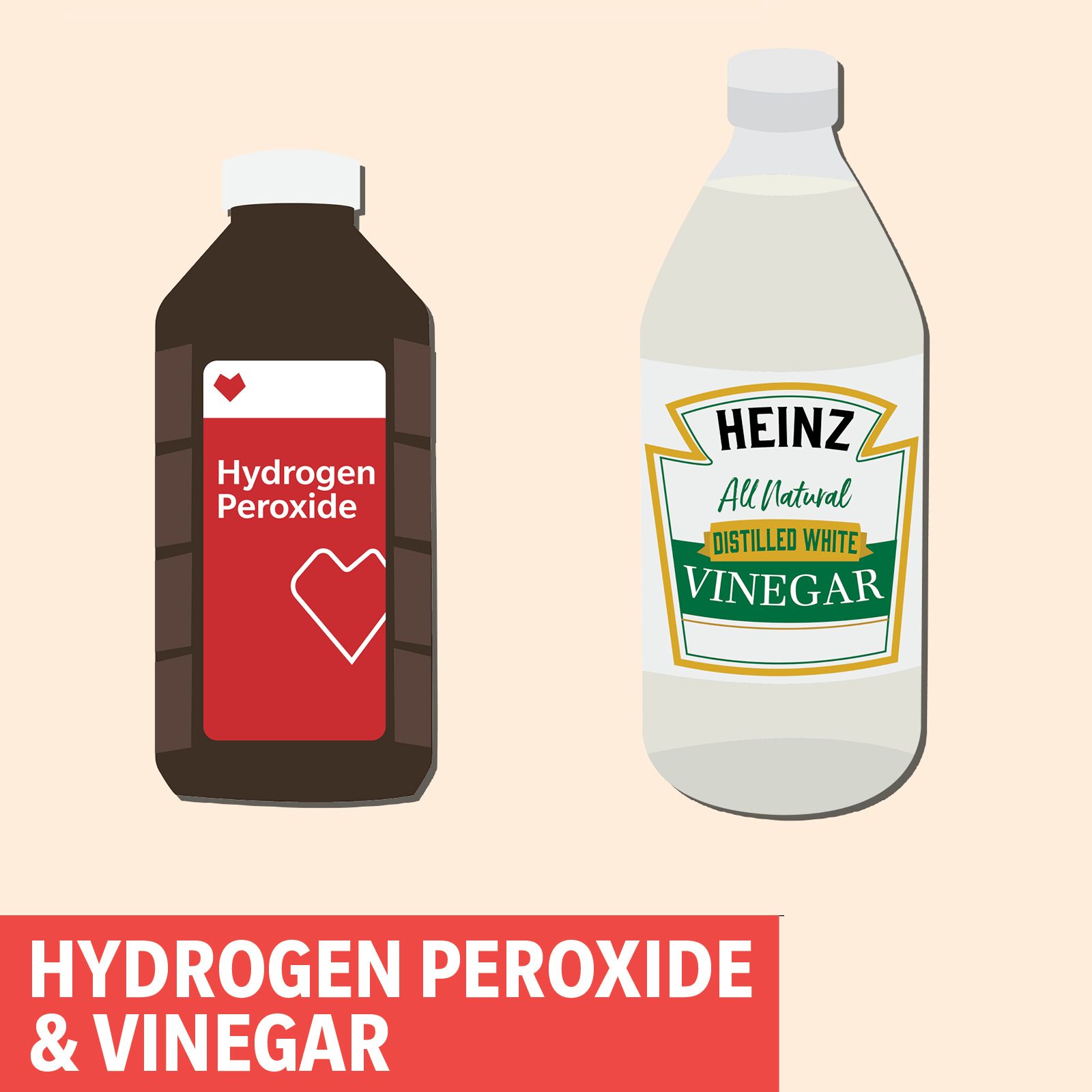 Alone, they’re considered great natural cleaning ingredients, but when combined, hydrogen peroxide and vinegar create something called peracetic acid. The mixture is corrosive and might damage whatever surface you’re cleaning. It can also irritate the skin, eyes and respiratory system.