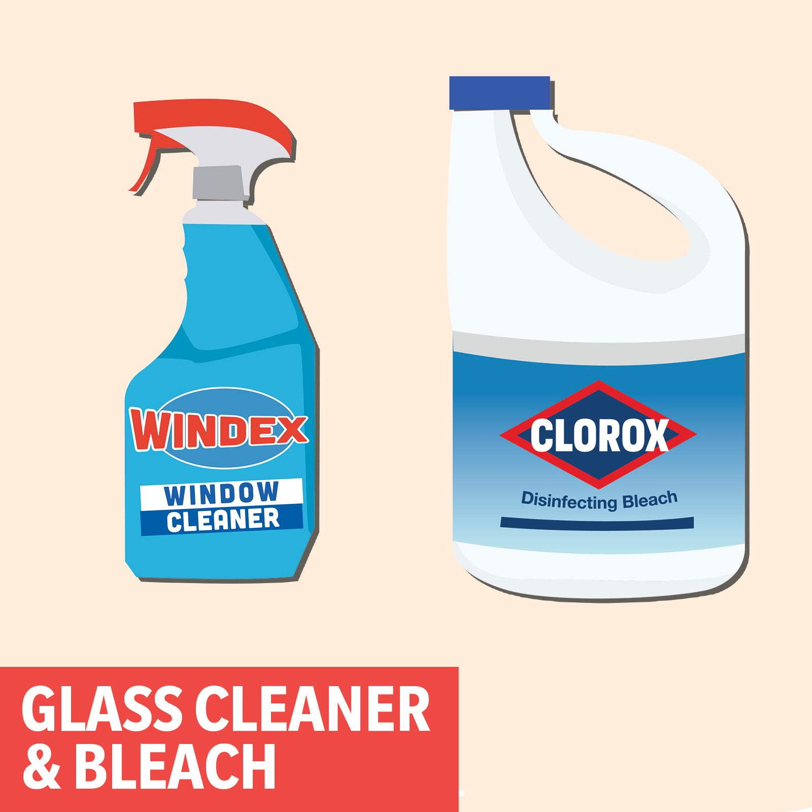 Time to clean the windows? Remember, mixing bleach with glass cleaner like Windex releases toxic gases and produces toxic chemicals. Though there are ammonia-free Windex options, one of the ingredients in regular Windex is ammonia. The combination of ammonia and bleach’s main ingredient, sodium hypochlorite, produces chloramine vapor.
