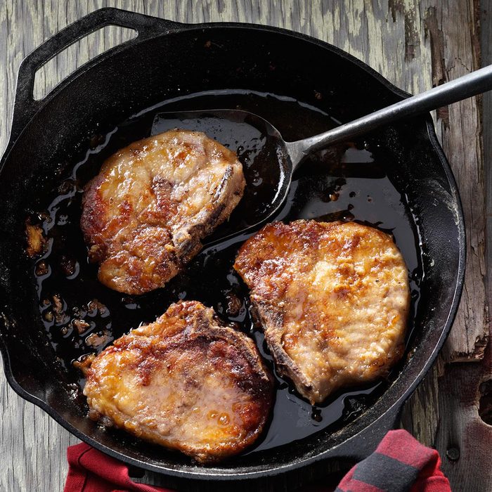 1 pork chop with 1/3 cup sauce: 232 calories, 10g fat (3g saturated fat), 60mg cholesterol, 161mg sodium, 7g carbohydrate (2g sugars, 1g fiber), 24g protein. Diabetic Exchanges: 3 lean meat, 1/2 starch, 1/2 fat.