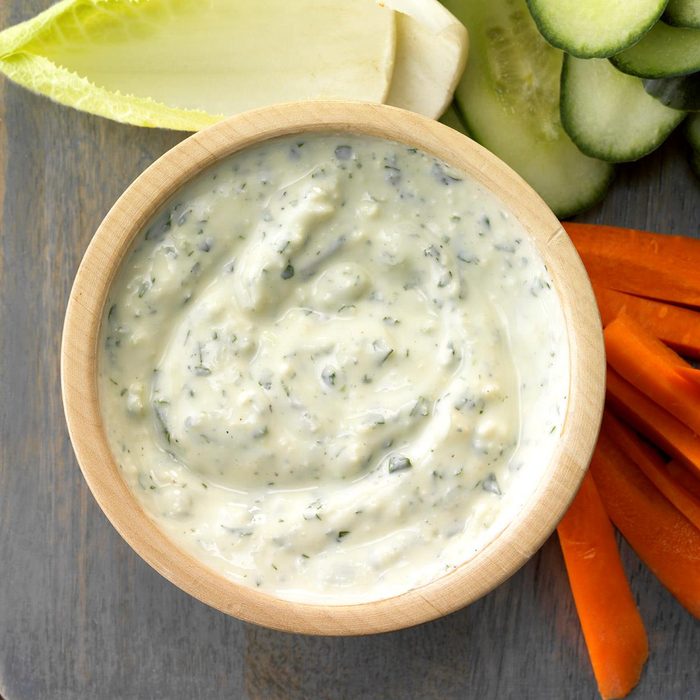 This creamy dip may look cool, but don’t be deceived! It gets a kick from horseradish and a few dashes of hot sauce.