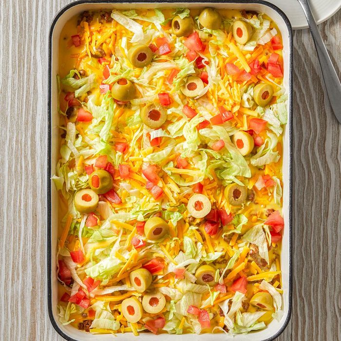 Served as the main dish at our family reunion buffet, this flavorful layered taco-style dish was a true crowd-pleaser. Folks were pleasantly surprised to find a rice layer, and everyone enjoys the creamy cheese sauce. —Jill Steiner, Hancock, Minnesota