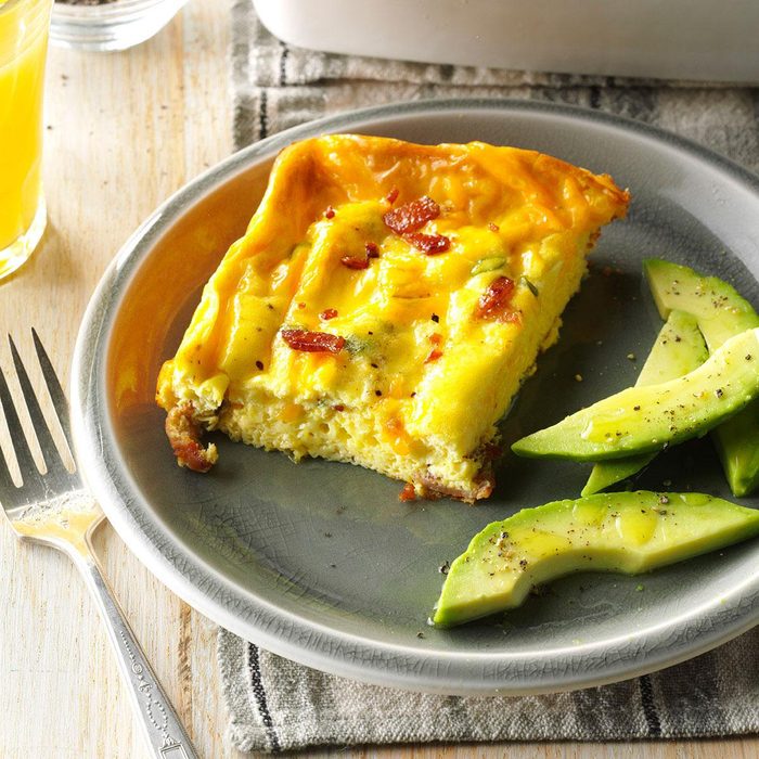 Because it’s fast to fix and such a great hit with family and friends, this egg casserole with bacon is a favorite of mine to make for brunches. Served with a fruit salad, hot muffins and croissants, it’s excellent for an after-church meal. —Deanna Durward-Orr, Windsor, Ontario