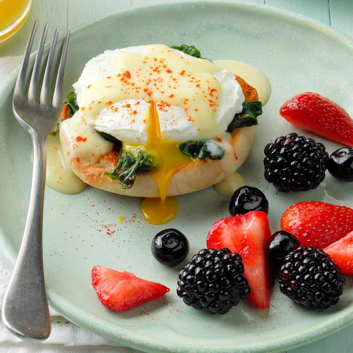 Legend has it that poached eggs on an English muffin started at Delmonico’s in New York. Here’s my take on this brunch classic, and don’t spare the hollandaise. —Barbara Pletzke, Herndon, Virginia
