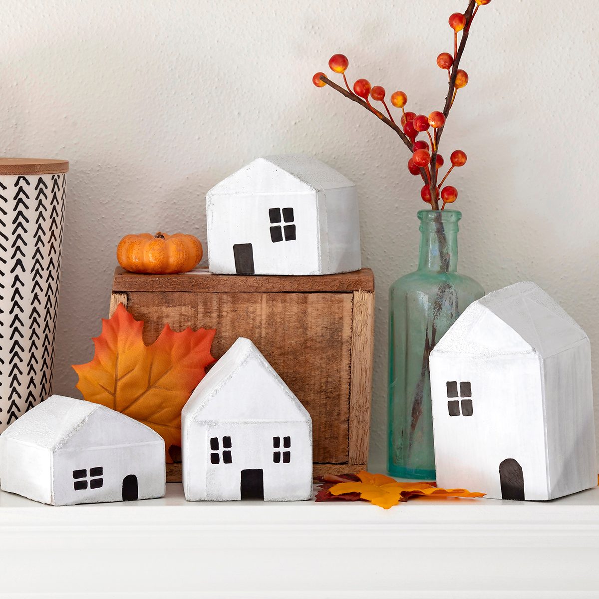 This is one of the best inexpensive holiday decorating tips for fall. Instead of tossing your old milk cartons in the recycling bin, use them as molds for these teeny tiny houses. Craft a house shape out of the cartons with tape and cardboard, then fill with a vinyl cement repair mix. When dry, cut away the cartons, sand down the edges and add finishing touches with a paint pen.