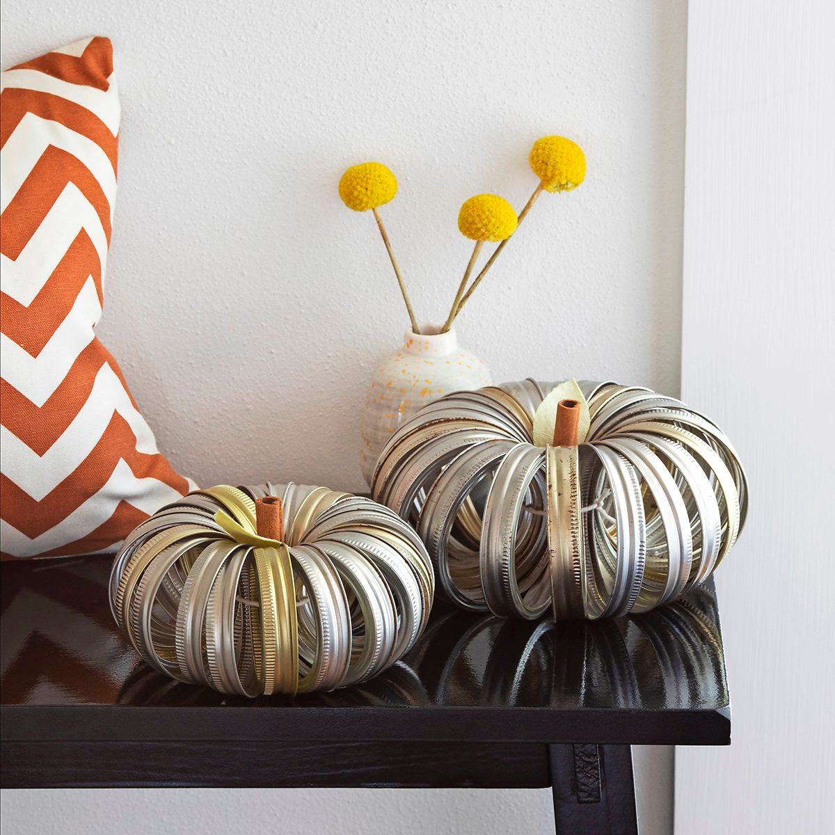 This cute craft combines two of our favorite things: pumpkins and canning! Dig through your stash of mason jar lids and gather 20 rings, all the same size—it’s OK if they’re a little rusty. Thread them on a length of twine, all facing the same direction. Then, tie the twine in a tight knot and fan the rings out so they look like a pumpkin. Finish with a cinnamon stick and felt leaves, if desired. For more autumn decorations, check out these pretty fall wreath ideas.
