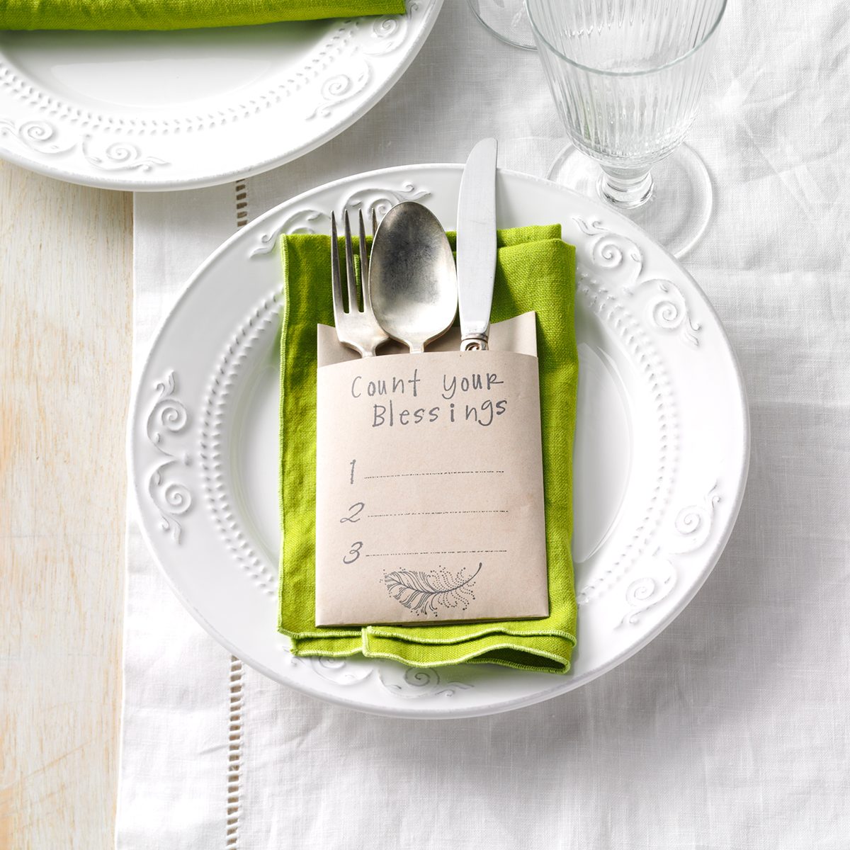 Count your blessings on Thanksgiving with this cute place card idea. Fold craft paper into an envelope that can fit your silverware inside. Then using just a felt pen (and your best penmanship) create your Thanksgiving design. Finish off with stickers, stamps or just a quickly drawn leaf. This is a great way to get the family reflecting on the year and what everyone is thankful for.