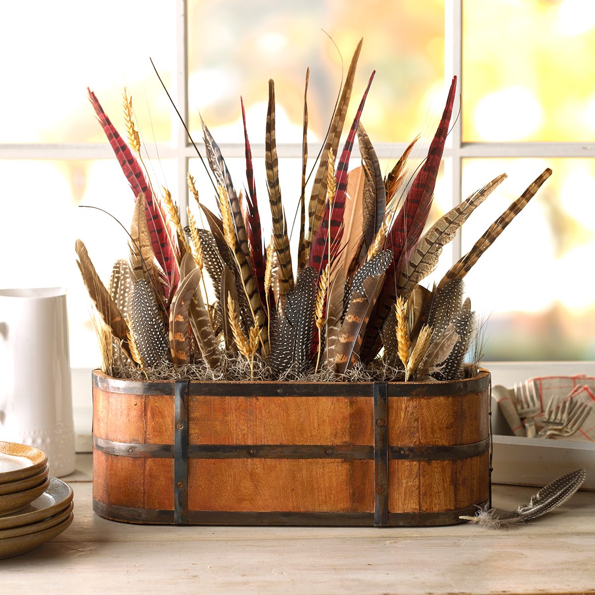 Looking to depart from traditional centerpieces this fall? Trade in flowers and gourds for feathers! To make a version of this fall craft for yourself, you’ll want to grab some floral foam, feathers (use the ones from the craft shop—not the ones you find on the ground), moss (find this in the floral section of shops like Michaels) and the container of your choosing. Insert the foam into the container making sure it fits snugly. Then fill with as many feathers as you choose. Fill in any gaps at the base with the moss. This is a great way to give a nod to Turkey Day without being too over-the-top.