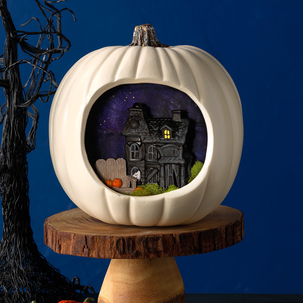Who can resist this adorable fall craft? It looks a bit tricky, but we assure you it’s a cinch! All you need for this one is a faux pumpkin (you can find these at most craft stores and even some big box stores), a small haunted house figurine and some dark craft paint. To make, trace an oval onto your pumpkin and carefully cut this out using a craft knife. Then paint the inside of your pumpkin a dark blue to make it look like the night sky. Place your haunted house figure inside and secure with some hot glue. You can finish it off with some moss or festive paper shreds for a more complete look. Not into haunted houses? You can reimagine this craft and use a barn figurine for something more harvest-inspired.