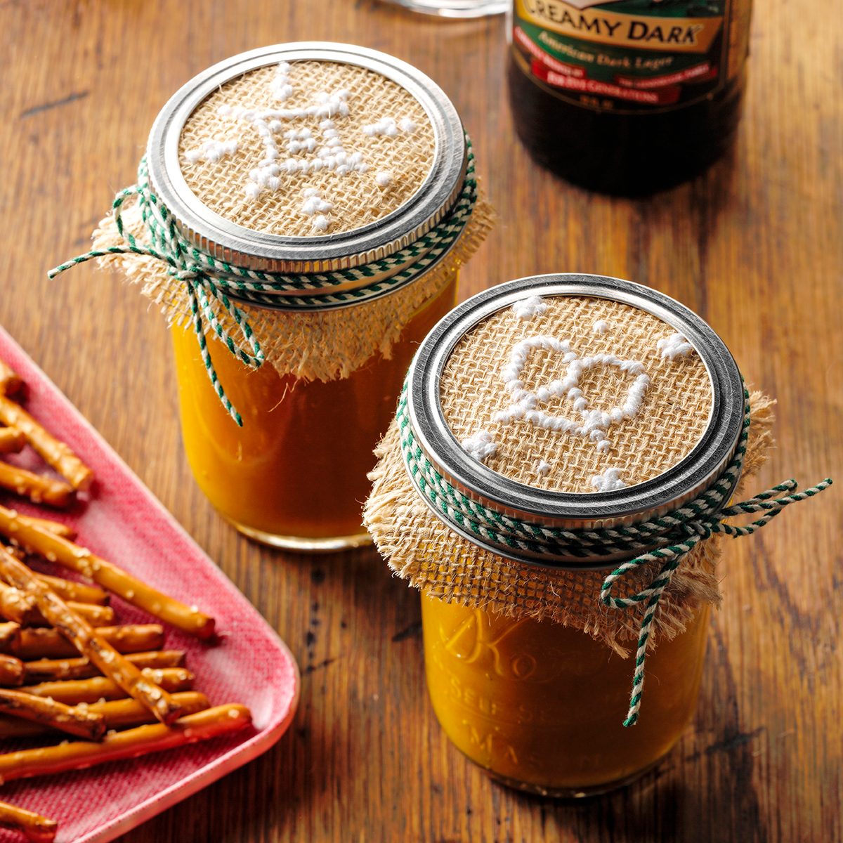 Giving away treats in jars this season? Make the presentation just a bit sweeter and layer on a layer of burlap. Take it to the next level and stitch a pretty design on top. That pretzel is the perfect finishing touch for gifting this spiced maple mustard recipe.