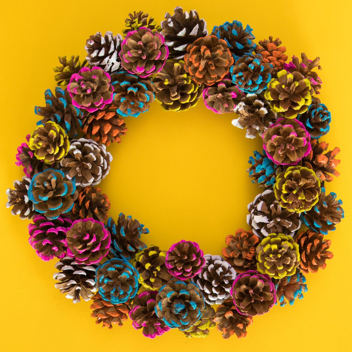 Fall crafts don’t have to stick to the same red, orange and yellow color palette to be festive. In fact, incorporating a few funky colors can add new life to a classic craft supply like pinecones. To make this wreath, paint the edges of pinecones with multiple colors of craft paint. And don’t worry about collecting the pinecones yourself—you can find them for sale in the floral aisle of your favorite craft store or online. Once dry, use hot glue to stick the pinecones to a wire wreath frame. Get the full details from Sarah Hearts.
