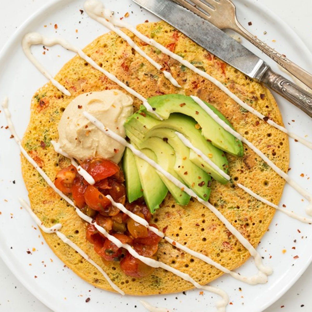 Subbing out white flour for chickpea flour makes vegan pancakes a savory treat. Whisk ½ cup chickpea flour with garlic powder, salt, black pepper, and ¼ teaspoon baking powder, then add ½ cup of water and keep whisking until the clumps are gone. Add ¼ cup each diced red pepper and green onion, then transfer the mixture to a skillet with olive oil on medium heat. Cook about five minutes, or until lightly golden, before flipping. Serve with savory toppings like hummus, salsa, or avocado. Check out the full instructions at Oh She Glows.