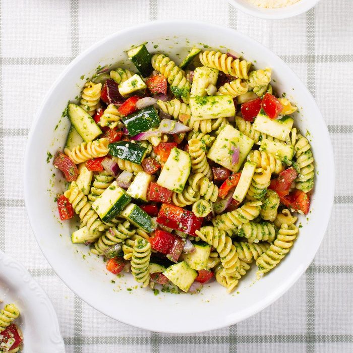 My family and I live on a homestead in the Missouri Ozarks and produce much of our own food. In the summer, when the garden is bursting with fresh vegetables and it’s too hot to cook, I like to use the season's veggies for pesto pasta salad and other cool meals. —Sarah Mathews, Ava, Missouri