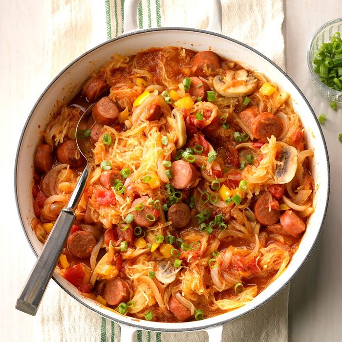 My son’s favorite dish uses homegrown spaghetti squash, kielbasa, and pico de gallo or salsa. —Pam Mascarenas, Taylorsville, Utah