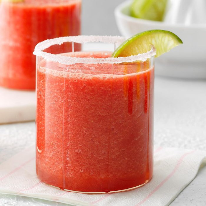 Melon liqueur dramatically changes the flavor and color of a classic margarita and also makes it sweeter. If you’d like your melon margarita a little more tart, cut back on the liqueur just a tiny bit. —James Schend, Taste of Home Deputy Editor