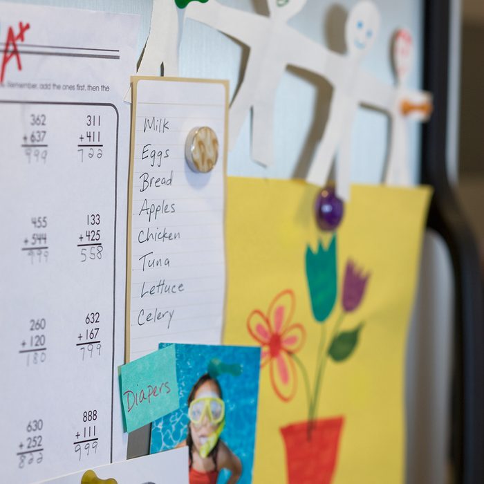 Post a list of your family’s must-have grocery items. Get everyone in the habit of circling the item when it’s used up or almost gone.