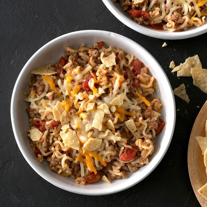 Sometimes I'll make extra of this comforting, noodle-y supper to guarantee leftovers. It's a great take-along dish for work or school. Trim calories from the entree by substituting ground turkey for the beef and low-fat cheese for the full-fat cheddar. —Tabitha Allen, Cypress, Texas