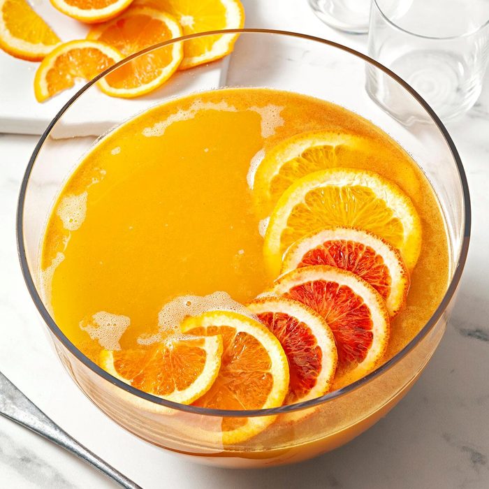 As a table brightener, fix a bowl of festive fruity punch—it's a refreshing beverage you can mix together in moments. To dress it up even more, I add an ice ring filled with oranges, lemons and cranberries. —Karen Ann Bland, Gove, Kansas