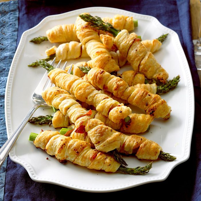 Asparagus makes lovely finger food, especially wrapped in pastry and tasty filling. Easily assembled, it’s perfect for weeknight noshing or something a little fancier for entertaining. —Linda Hall, Evington, Virginia