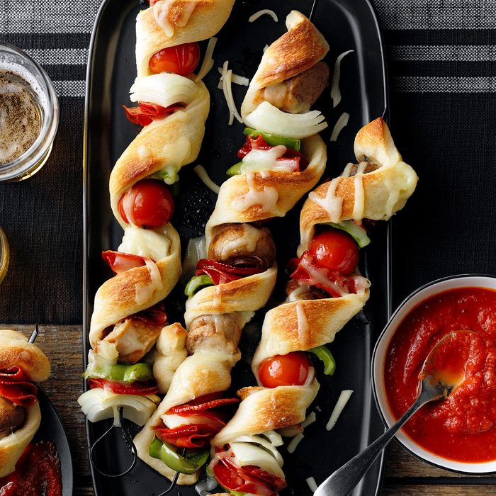 I’m convinced food on a stick is more fun to eat—pizza included! These skewers are a creative, less-messy way to enjoy pizza flavors, and you can customize them with all your favorite toppings. We layer Italian sausage with pepperoni, veggies, strips of pizza dough and a sprinkle of shredded mozzarella, then bake and serve with pizza sauce for dipping.