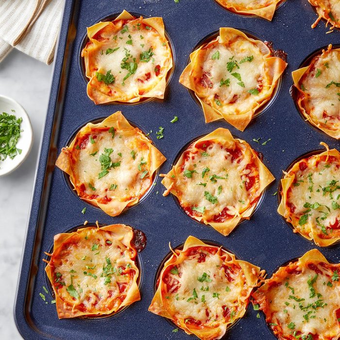These muffin-tin lasagna cups pack all the cheesy, saucy flavor of classic lasagna into a perfectly portable, lunchbox-friendly size. Layers of creamy ricotta, pasta sauce and a blend of melty Italian cheeses are baked in crispy wonton wrappers. These cups are easier (and less messy!) to enjoy than traditional lasagna—no slicing required.