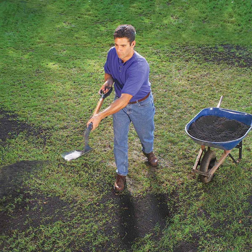 To apply compost, spread it over your lawn with a shovel, aiming for a layer 1/4- to 1/2-in. thick. Then work it into the turf with a rake. It’s best to do this after aerating. Most garden centers sell bagged compost. But to cover an entire yard, you’re better off buying in bulk. Don’t worry about buying too much—any leftovers will benefit your garden and shrub beds. By the way, here’s how to start composting at home.