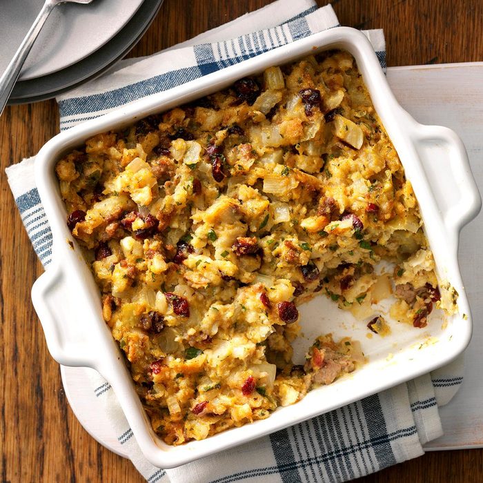 This moist dressing is perfect when paired with poultry or even pork. The sweet-tart flavor of the dried cranberries really complements the dish's turkey sausage. —Corinne Portteus, Albuquerque, New Mexico