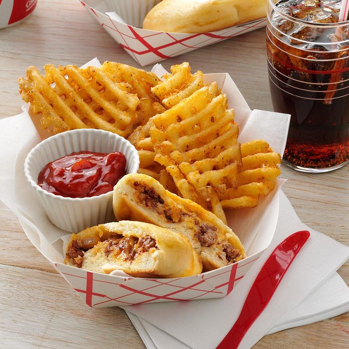 My mom stuffs soft homemade yeast rolls with ground beef, tomato sauce and cheese to make these tasty sandwiches. They're great leftovers, too. My son takes them in his lunch the next day. —Nancy Holland, Morgan Hill, California