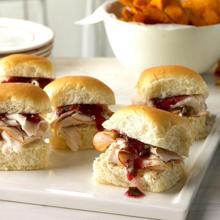 Turkey sliders with ginger, horseradish and cranberry sauce refrigerate well, so I keep them ready for get-togethers around Thanksgiving. —Pamela Miller, Big Rapids, Michigan