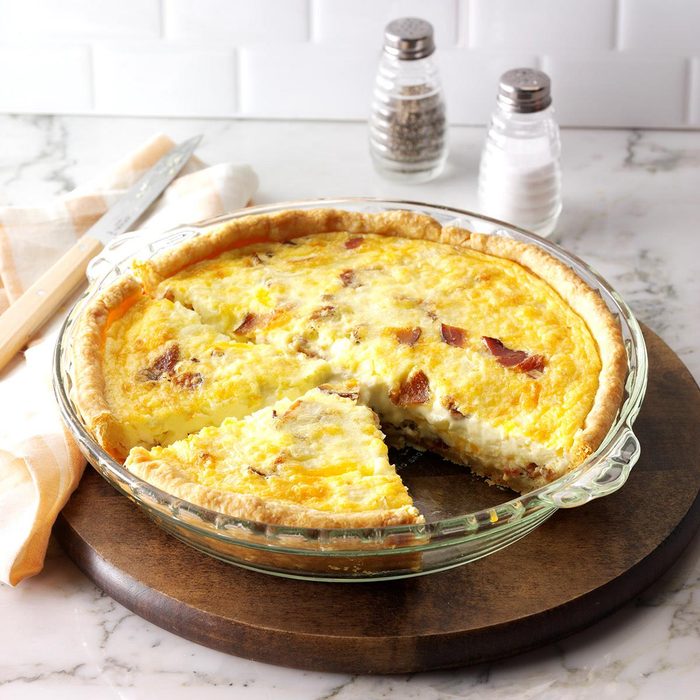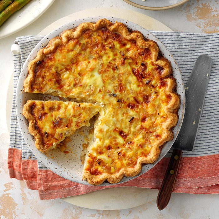 Nestled in a buttery, rustic crust, this quiche is filled with sweet onions, bacon bits and cheese. Splurge on high-quality cheese to achieve that “best” flavor.
