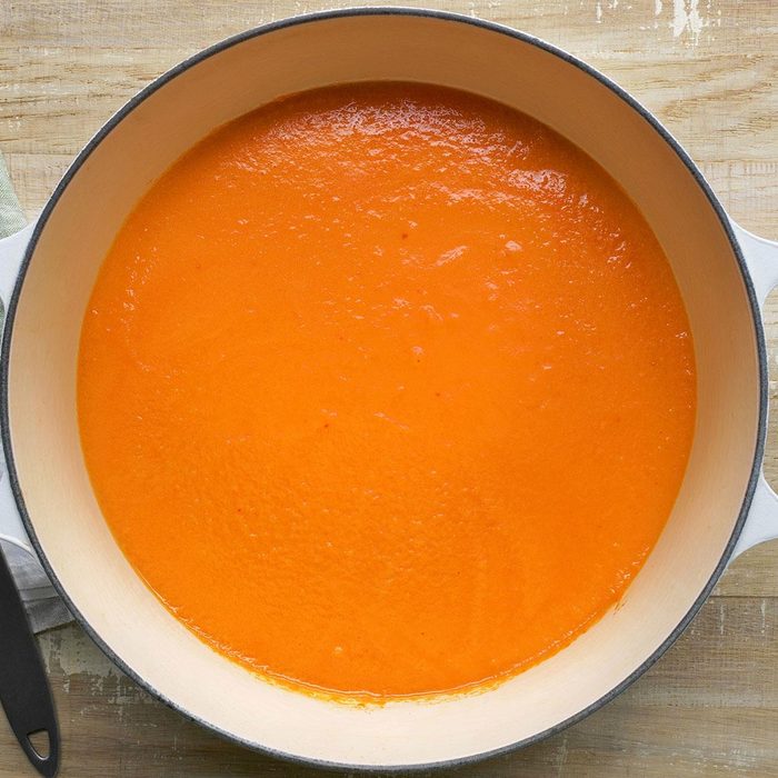 This soup uses a twist on the holy trinity: sauteed celery, onion and red pepper. A bit of sugar brings out the tomatoes’ natural sweetness and tempers the acidity.