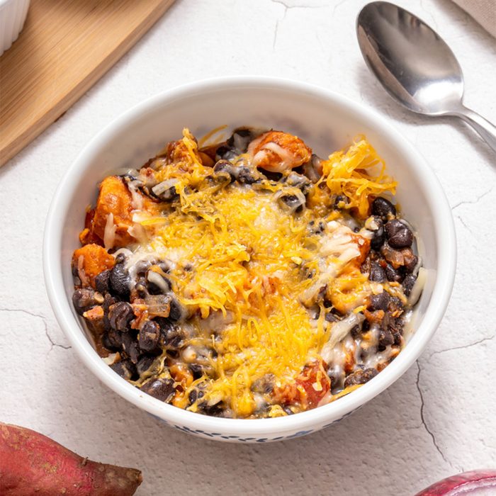 This meatless chili blends tender sweet potatoes with the earthy flavor of black beans. A hint of brewed coffee deepens the rich, smoky chili powder and cumin spices. Before digging in, pile your bowl high with your favorite toppings like shredded cheese or pickled red onions.