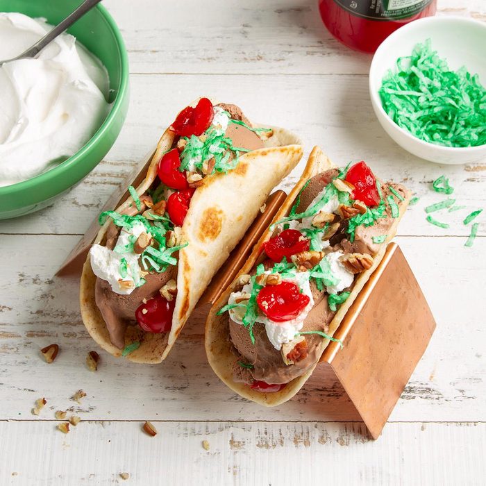 Ice Cream Tacos look just like the real thing—but they’re stuffed with chocolate ice cream and topped with cherries and coconut instead of tomatoes and lettuce. These are as much fun to make as to eat. —Karen Oney, Fort Worth, Texas