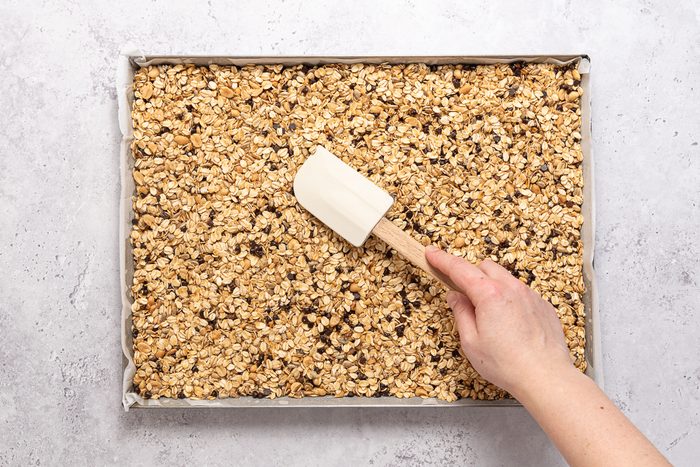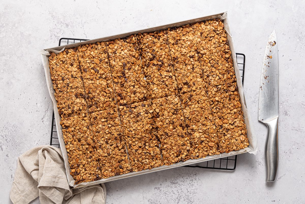 To make this chewy granola bar recipe vegan, replace the chocolate chips with vegan chocolate or with your favorite dried fruit. Swapping in coconut oil or a nut butter for the butter is our next tip, or mix the two if you want a slightly nutty taste.