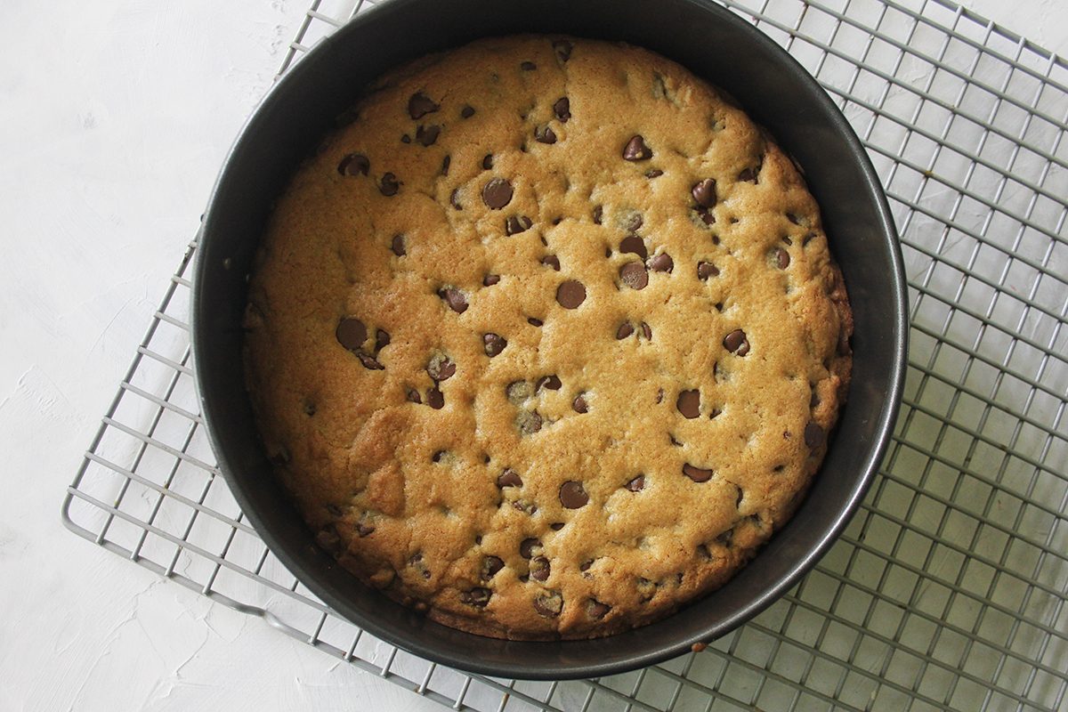 Pay attention, chewy cookie lovers! Ensure that this cake stays moist by not over-baking it. After 20 to 25 minutes, this cookie should come out of the oven. It may look a little soft in the middle, but it will continue to bake for a few minutes after being removed from the oven thanks to the carryover heat.
