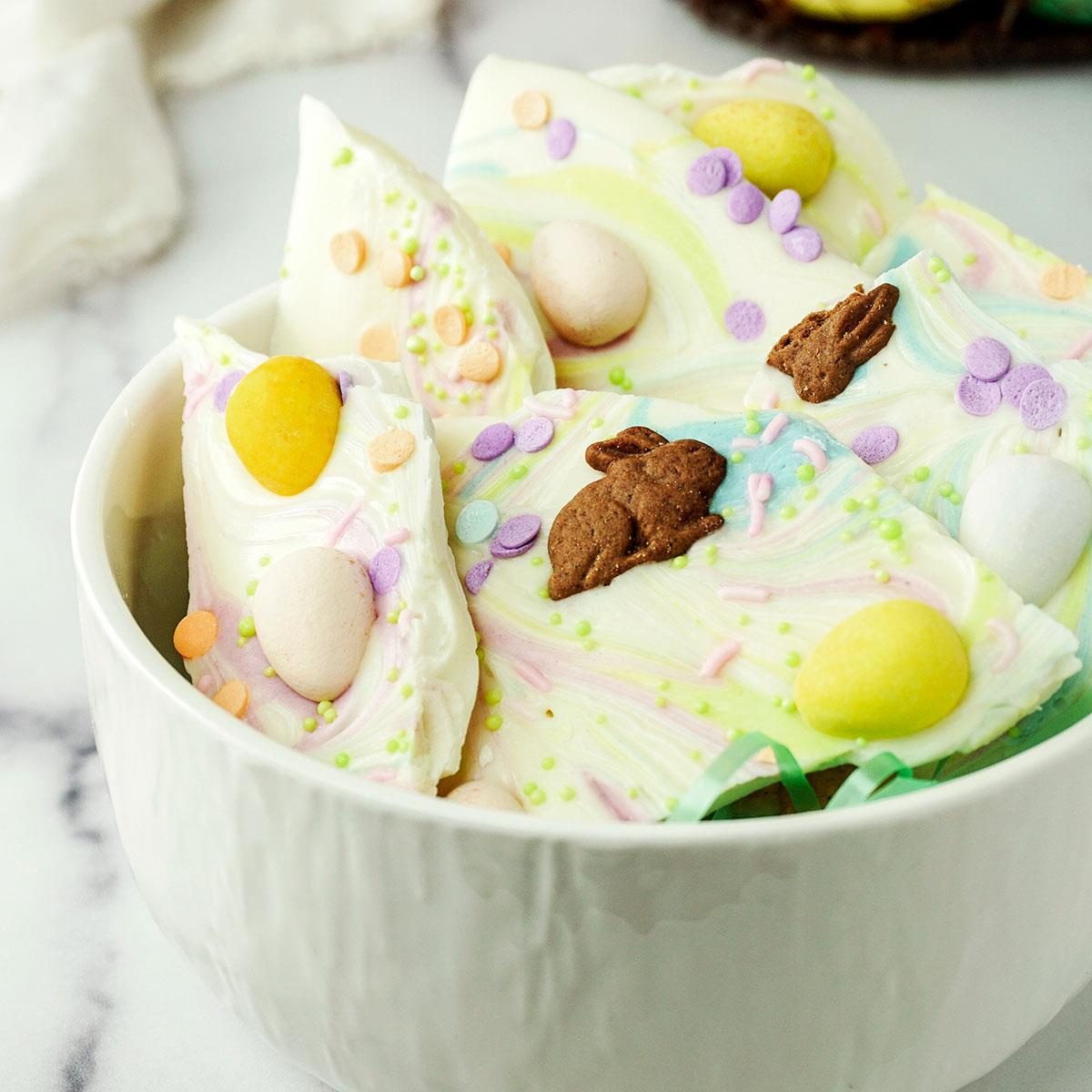 This festive and colorful bunny bark is a hopping good treat to serve on Easter—or to stuff into baskets from...