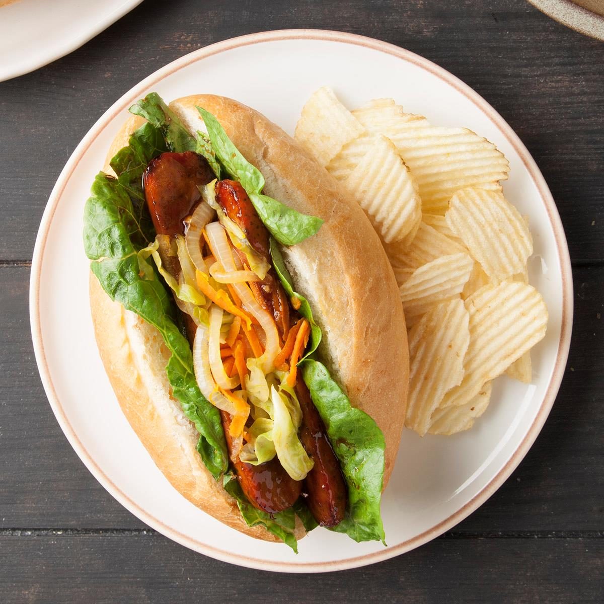 My version of the classic Vietnamese sandwich combines the satisfying flavor of chicken sausage with tangy vegetables pickled in rice...