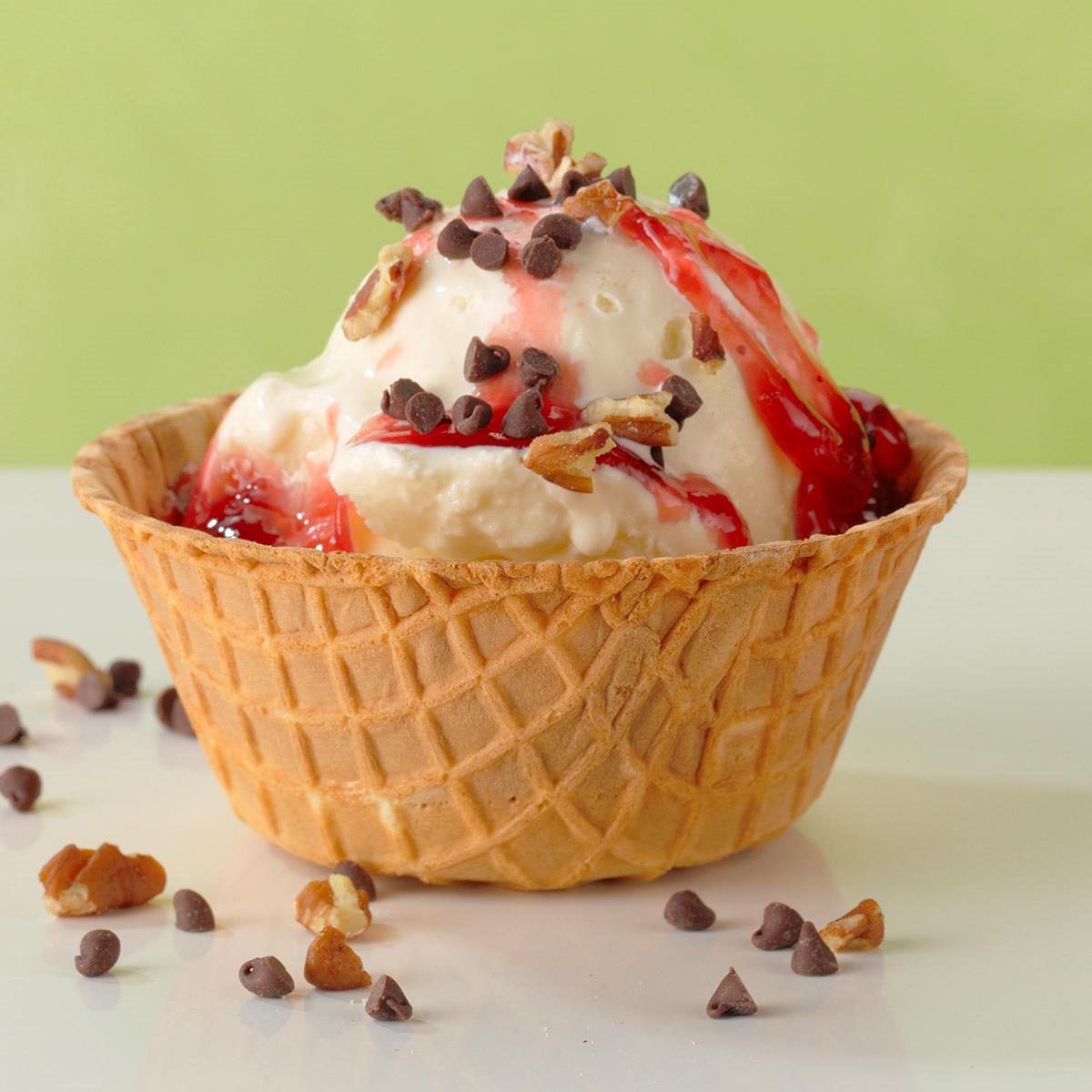 A scoop of vanilla ice cream topped with strawberry jam, chocolate chips and chopped nuts. —Donna Paprocki, Des Plaines, Illinois