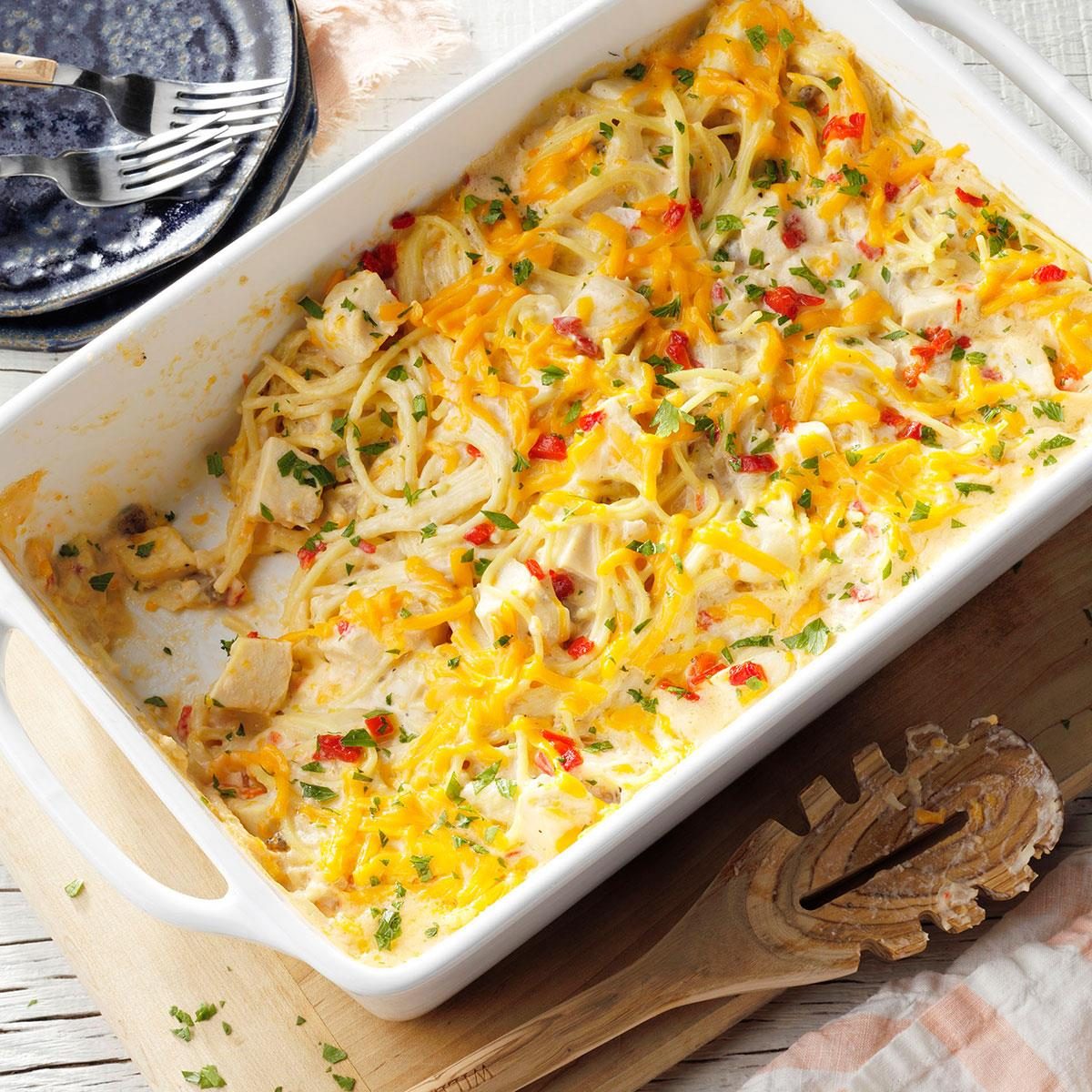 Want to mix up pasta night? You'll welcome this cheesy chicken spaghetti recipe into your weekly rotation.