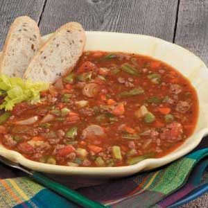 This chunky soup is loaded with tender beef stew meat, carrots, potatoes and green beans—and it sure is tasty! A...